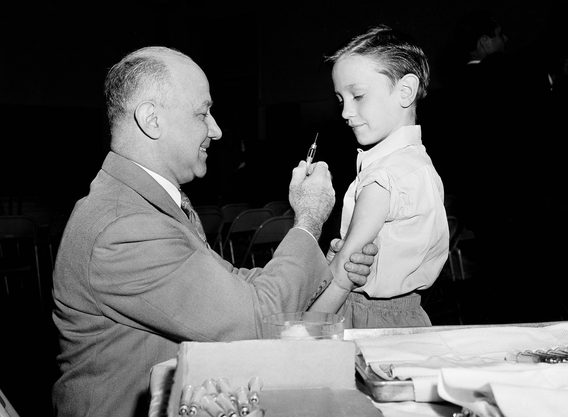 Cậu bé 7 tuổi Leonard “Bobo” Scheele, con trai của Bác sĩ phẫu thuật, Đại tướng Leonard Scheele, được Tiến sĩ Samuel Luber, tại trường Georgetown ở Washington, tiêm chủng chống lại bệnh bại liệt.
