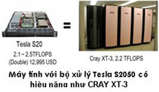 Một sự kiện rất đáng chú ý trong lĩnh vực tính toán hiệu năng cao là Tính toán vạn năng trên các bộ xử lý đồ họa, viết tắt là GPGPU. Đây là sự kết hợp giữa “xử lý vạn năng” (GP, general purpose) và “đơn vị xử lý đồ họa” (GPU, graphical processing unit). GPU là bộ xử lý làm các nhiệm vụ tính toán đồ họa thường được dùng trong các hệ nhúng, điện thoại di động, máy tính cá nhân, trạm làm việc, và các màn hình game. Chuyên dụng cho nhiệm vụ xử lý đồ họa, các GPU với cấu trúc tính toán song song thích hợp đã thực hiện với hiệu năng rất cao một lớp bài toán phức tạp. Trong những năm gần đây, GPU đã được phát triển và tiến hóa thành những bộ xử lý hết sức linh hoạt và mạnh về khả năng lập trình, độ chính xác và hiệu quả. GPGPU chính là việc mở rộng GPU cho các nhiệm vụ tính toán khác. Khó khăn lớn của việc lập trình trên GPGPU được vượt qua gần đây bởi kiến trúc CUDA của hãng NVIDIA, cho phép xây dựng các ứng dụng trên các ngôn ngữ thông dụng nhất như C, và cả với Python, Fortran, Java, hay Matlab. Điều đáng để ta quan tâm nhất là giá thành rất thấp của các bộ GPGPU. Chẳng hạn một bộ GPGPU Tesla S2050 của hãng NVIDIA với giá 12,995 USD khi lắp vào một máy tính thông thường có thể đạt tốc tính toán 2,1-2,5 teraflops (triệu triệu phép tính mỗi giây) 6. Chú ý rằng đây là tốc độ tính toán của siêu máy tính CRAY XT-3 (2,2 teraflops) phiên bản năm 2004 với giá quãng 2 triệu USD. |