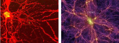 ![]() Hình 1. Hai mạng thuộc hai đối tượng khác nhau : não bộ của con chuột (bên trái) và cấu trúc vĩ mô của vũ trụ (bên phải). |