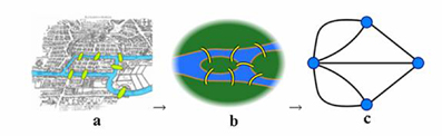 ![]() Hình 2.Hình (2a) là bản đồ thành phố Königsberg thế kỷ thứ 18 với 7 chiếc cầu, hình (2b) là giản đồ của thành phố còn( 1c) là đồ hình toán học tương đương gồm 4 nút và 7 đường nối. |