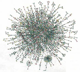 ![]() Hình 9. Sơ đồ các protein tương tác với nhau của chất men (yeast) cho thấy những trục có nhiều đường liên kết, đó là những protein thiết cốt cho sự sống của tế bào. Trong đó có một số trục quan trọng bậc nhất . Sự loại bỏ những protein này dẫn đến sự chết của tế bào. |