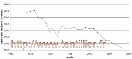 Đồ thị thứ nhất là lương khởi điểm thô (trước khi bị trừ các khoản) của giảng viên chính thức đại học ở Pháp (MCF). Trong khi nền kinh tế đi lên, thì lương ở đại học đi xuống: