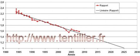 Trong 3 thập kỷ đó (từ thập kỷ 1980 cho đến 2010) có cả cánh tả và cánh hữu ở Pháp nắm quyền điều khiển đất nước, nên sự thảm hại trên không phải là do “hữu” hay do “tả”, mà là một xu hướng coi thường công việc làm khoa học nói chung của toàn xã hội ! Đồ thị thứ hai là tỷ lệ giữa lương khởi điểm của giảng viên chính thức đại học (MCF) và lương tối thiểu trong xã hội. Lương tối thiểu đi lên trong mấy thập kỷ qua, làm cho đại học ngày càng gần tối thiểu, nghề giảng viên trở thành như một thứ nghề rẻ tiền: