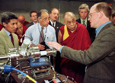![]() Diễn giải Geshe Thupten Jinpa (phía trái xa), giáo sư Ned Kalin và Đạt Lai Lạt Ma đang lắng nghe nhà vật lý Andy Roberts (phải) giải thích phương pháp máy gia tốc tandem sản sinh ra những chất đánh dấu sử dụng trong các máy scaner PET ở Phòng thí nghiệm Keck.