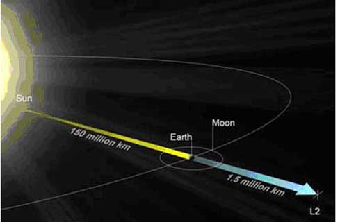Hubble bay vòng quanh trái đất ở độ cao khoảng 600 km, hoạt động ở khoảng nhiệt độ phòng thông thường (20 – 30 oC), vì vật mù đối với ánh sáng hồng ngoại từ các vật thể lạnh ở rất xa. Để hoạt động tốt ở dải tần hồng ngoại, kính thiên văn James Webb phải nằm ở vị trí rất ổn định và tránh được ánh sáng trực tiếp từ mặt trời. Rất may cho chúng ta là trong không gian tồn tại một điểm cân bằng trọng lực giữa trái đất và mặt trời gọi là điểm Lagrange 2 (3). Điểm L2 nằm sau mặt trời và trái đất do đó trái đất đã tạo thành một tấm chắn to lớn che được ánh sáng của mặt trời (xem ảnh). Thêm vào đó, trọng lực của trái đất và mặt trời có thể giữ thăng bằng lên các vật ở điểm này nên sẽ tốn ít lực đẩy để giữ vệ tinh cố định. Nhờ không gian lạnh và cố định của L2 mà các kính thiên văn hồn ngoại hiện tại (Herschel và Planck) đang hoạt động ở điểm này và vì vậy mà L2 cũng được chọn làm đích đến cho kính thiên văn James Webb.