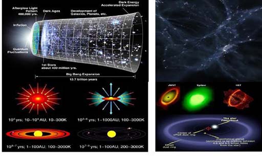 ![]() Lịch sử vũ trụ theo lý thuyết Big Bang (trên trái), quá trinh hình thành và kết cấu thiên hà (trên phải), quá trình hình thành sao (dưới trái), quá trình hình thành hành tinh (dưới phải). |