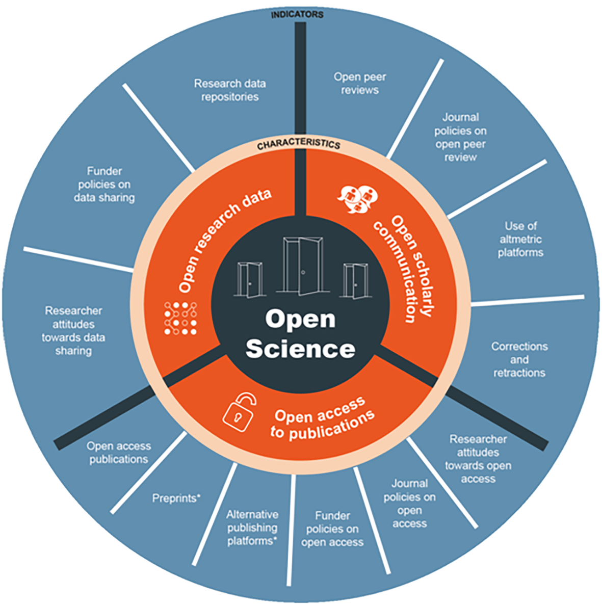 Hình 1: Bánh xe Khoa học Mở, mô tả các đặc tính và chỉ số chính của Khoa học Mở4, nhấn mạnh đặc biệt và trước nhất vào Truy cập Mở và Dữ liệu Mở.
