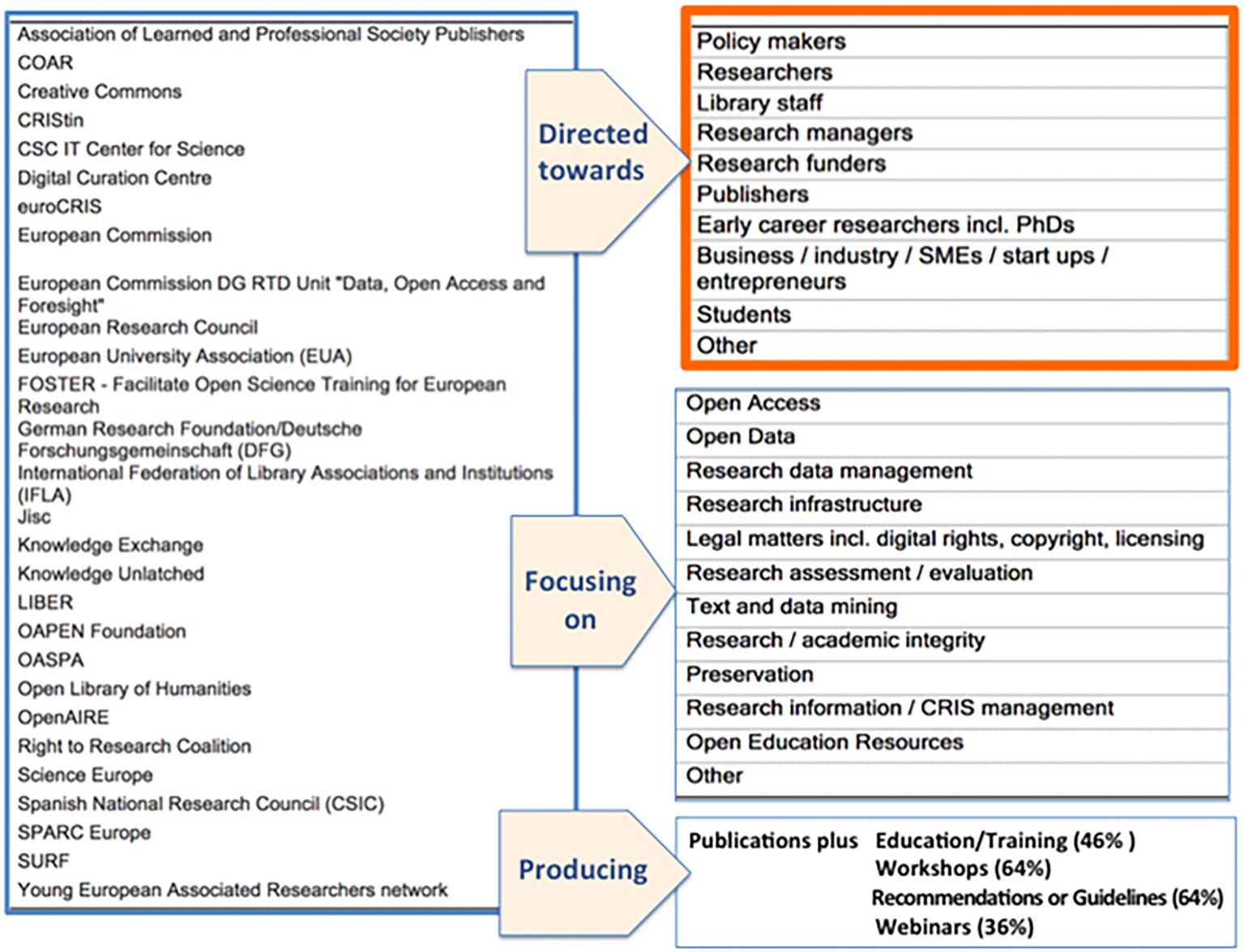 Hình 2: Các bên tham gia đóng góp cho nghiên cứu và cách tân cung cấp huấn luyện về các kỹ năng Khoa học Mở (dữ liệu có nguồn gốc từ SPARC Europe).