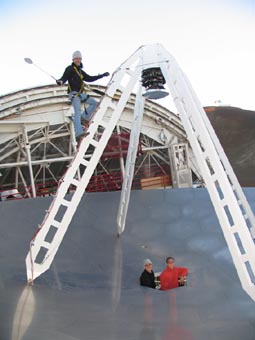 Khác với Keck và các đài thiên văn quang học khác, CSO (Caltech Submillimeter Observatory) chỉ được chế tạo cho các quan trắc ở bước sóng từ 0.3 mm đến vài mm (còn gọi là sóng cao tần hay vi ba). CSO bắt đầu đi vào hoạt động từ 1988, khi mà các kỹ thuật cảm biến cũng như thiết bị quan trắc vi ba còn sơ khai, và những kiến thức thiên văn trong vùng sóng này còn là một ẩn số. Gần hai mươi năm qua, CSO là nơi đi đầu trong việc phát triển các phương thức nghiên cứu cho các bước sóng vi ba, tạo tiền đề cho sự thành công sau này của các nhóm nghiên cứu về bức xạ nền và các lĩnh vực khác. Trong hình, từ trái sang, là Lieko Earle & Jason Glenn từ Đai học Colorado và James Bock từ JPL, đây là các thành viên của nhóm Z-Spec đang tìm cách tiếp cận mặt kính thứ hai của CSO.