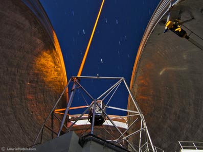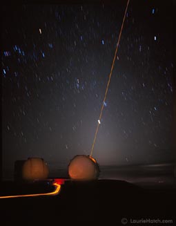 Keck dùng “adaptive optics”, tạm dịch là quang học thích nghi. Những biến động trong bầu khí quyển làm cho các vì sao “lấp lánh”, và vì thế làm nhòa các bức ảnh và giới hạn độ phân giải của các kính thiên văn trên mặt đất như Keck. Quang học thích nghi là kỹ thuật tiên tiến để vượt qua những trở ngại này, bằng cách thay đổi hình dạng của mảnh gương nhỏ một cách nhanh nhạy và liên tục để thích nghi với những biến chuyển trong đường đi của tia sáng do bầu khí quyển gây ra. Keck chiếu tia laser lên không trung để làm phát sáng khí sodium (Na), vốn ở cách bề mặt trái đất 90 km, tạo nên “ngôi sao nhân tạo” dùng để theo dõi những biến động của khí quyển. Với quang học thích nghi, kính thiên văn Keck có thể chụp những bức ảnh có độ rõ nét không kém các bức ảnh của kính thiên văn không gian Hubble, hay của James Webb Space Telescope trong tương lai (JWST là kính thiên văn lớn gấp ba Hubble, dự kiến sẽ phóng lên không gian trong vài năm nữa). (Ảnh của Laurie Hatch)