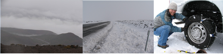 Bầu trời Mauna Kea không phải lúc nào cũng xanh trong, và thời tiết ở Mauna Kea không phải lúc nào cũng lý tưởng. Đây là những gì thấy được sau một cơn bão. Nhìn xuống núi quang cảnh thì “mờ nhân ảnh”, mà nhìn lên núi thì đường đi thượng đỉnh vẫn mịt mùng. Trong điều kiện thời tiết này, bánh xe buộc phải có vòng xích để khỏi bị trượt và rơi xuống núi. Trong hình là Lieko Earle, một sinh viên trong nhóm quan sát vừa tròng xong vòng xích cho xe.