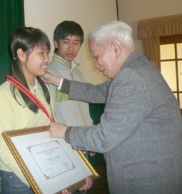 GS. Hoàng Tụy trao bằng khen và phần thưởng Lê Văn Thiêm cho học sinh đạt thành tích xuất sắc trong học tập. |