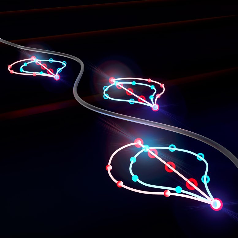 Trong vùng thấp bên dưới tia laser cận hồng ngoại chia tách hai electron (các vòng tròn rỗng) thành hai dạng lỗ (các vòng tròn đặc). Việc tích điện đã gia tốc chúng dịch chuyển xa nhau bằng dao động điện trường khỏi laser terahertz (sóng xám). Trường thay đổi sau đó kéo các vật mang điện tích hướng về nhau, kết hợp và phát xạ thành hai tia sáng. Các quỹ đạo được miêu tả trong một chiều không gian với thời gian chảy trôi từ dưới cùng bên phải lên tới trên cùng bên trái. Nguồn: Brian Long