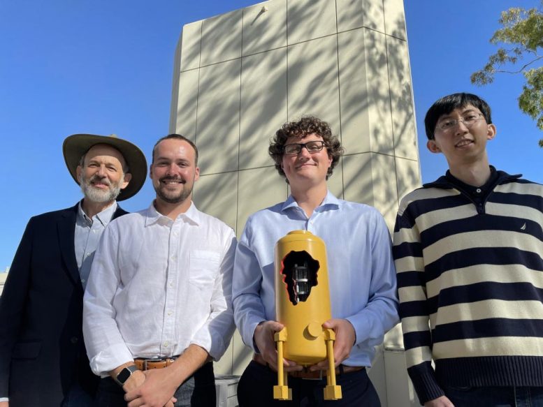 Từ trái sang phải: Mark Sherwin, Seamus O’Hara, Joe Costello và Qile Wu. Costello đang cầm một thiết bị ở quy mô mô hình của máy gia tốc UCSB FEL, đặt trong tòa nhà phía sau họ. Nguồn: Changyun Yoo