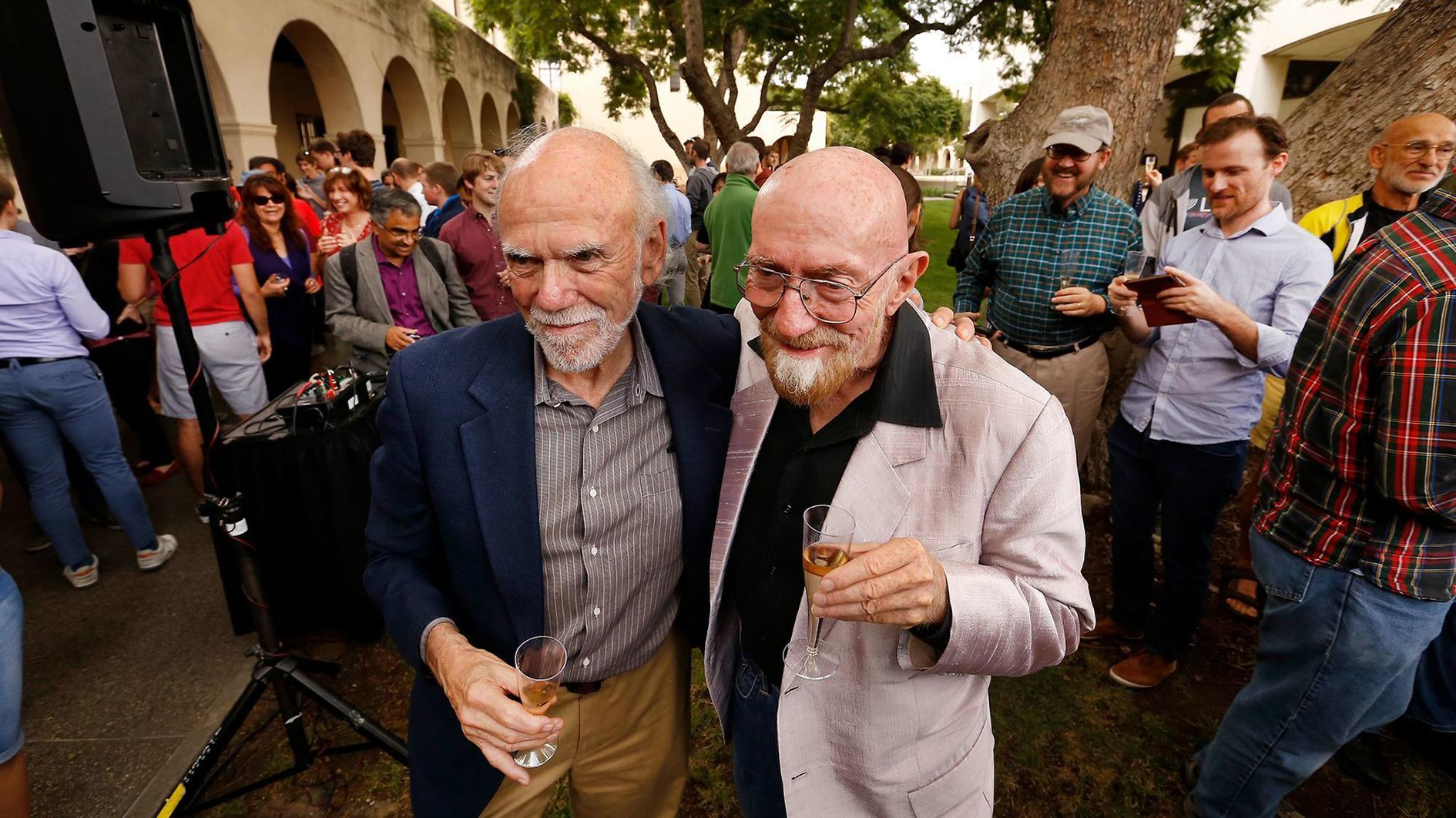 Hai nhà vật lý Bary Barish và Kip Thorne (Caltech) ăn mừng giải Nobel 2017. Bản thân Kip Thorn (phải) là người đồng sáng lập dự án LIGO từ năm 1984. Nguồn: Latimes