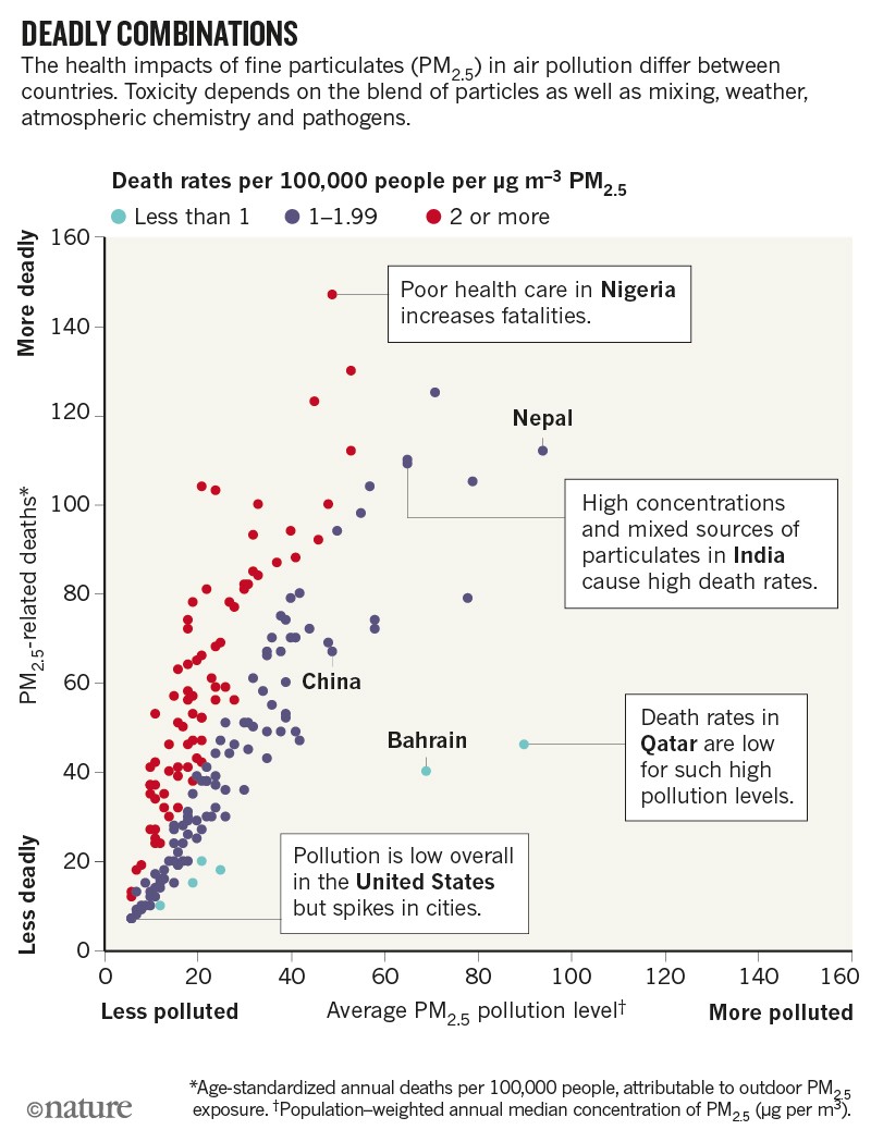 Nhưng các ước tính trung bình kiểu này đã mặc nhận rằng các hạt bụi mịn trên toàn thế giới đều giống nhau. Thật ra không phải thế. PM2.5 là một hỗn hợp các chất hóa học (gồm hydrocarbon, muối và các hợp chất từ hoạt động giao thông, bếp nấu và hoạt động sản xuất công nghiệp) và các thành phần tự nhiên khác như bụi và vi sinh vật. Hỗn hợp này – cùng độc tính của nó – thay đổi tùy theo địa điểm và thời gian, theo những những cách mà chúng ta không thể theo dõi, hiểu hay kiểm soát được. Ví dụ, ở châu Á, bồ hóng từ máy sưởi và bếp dân dụng là nguồn phát thải PM2.5 lớn nhất. Ở các nước châu Âu, Nga, Thổ Nhĩ Kỳ, Hàn Quốc, Nhật Bản và miền Đông Hoa Kỳ, khí thải nông nghiệp như amoniac là nguồn phát thải chính. Hiện chúng ta vẫn chưa rõ trong số trên, đâu là nguồn phát thải nguy hiểm nhất.