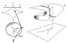d. Một ví dụ lý thú trong tâm lý học do Zeeman đưa ra (xem hình 6): khi một thanh niên tìm cách tiếp cận một thiếu nữ (quỹ đạo 1), thường người thiếu nữ lúc đầu e lệ có ý tránh xa (quỹ đạo 2). Song dần dần thiếu nữ chịu làm quen, còn nhiệt tình của người thanh niên có giảm đi một chút ít. Đến một lúc đột nhiên giữa hai người nảy sinh một mối cảm tình mạnh mẽ (quỹ đạo 3). Mặt cong K biểu diễn tình cảm giữa hai người nam nữ. Các biến số ngoài biểu diễn khoảng cách xa gần giữa hai đối tượng. Thái độ ban đầu của thiếu nữ ứng với phần gấp dưới của mặt K. Khi có đột biến về mặt tình cảm thì sẽ có bước nhảy từ phần gấp dưới lên phần gấp trên. Đây là tai biến nếp gấp lùi (N=1,C=2).