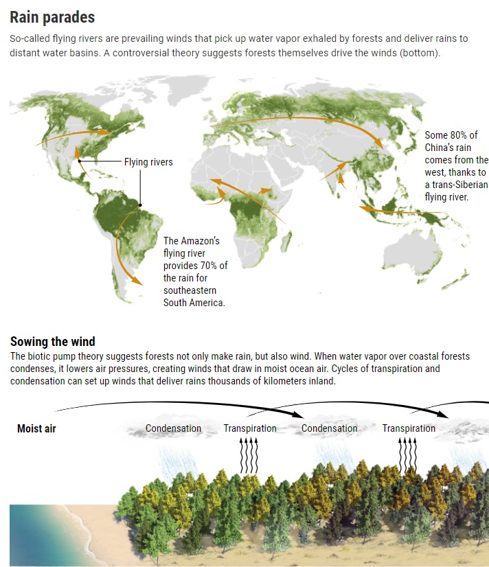 Điều đáng lo ngại là nạn phá rừng trong tương lai có thể khiến các khu vực khác trở thành hoang mạc, ví dụ như khu vực từ rừng nhiệt đới Amazon đến vùng xa-van. Các vùng quê ở Trung quốc, châu Phi và Pampas ở Argentian cũng đang bị đe dọa, theo Patrick Keys, một nhà hóa học khí quyển tại Đại học Bang Colorado, Fort Collins. Vào năm 2018, Keys và đồng nghiệp đã áp dụng cách tương tự như Van der Ent’s để theo dõi nguồn mưa cho 29 siêu đô thị trên toàn cầu. Ông thấy 19 khu vực phụ thuộc rất nhiều vào những khu rừng ở xa xôi để cung cấp nguồn nước, bao gồm Karachi, Pakistan; Vũ Hán và Thượng Hải, Trung Quốc; New Delhi và Kol-kata, Ấn Độ. Ngay cả những thay đổi nhỏ trong lượng mưa – điều phát sinh từ việc thay đổi mục đích sử dụng đất có thể tác động đến việc cung cấp nước vốn đã mong manh, ”ông nói.