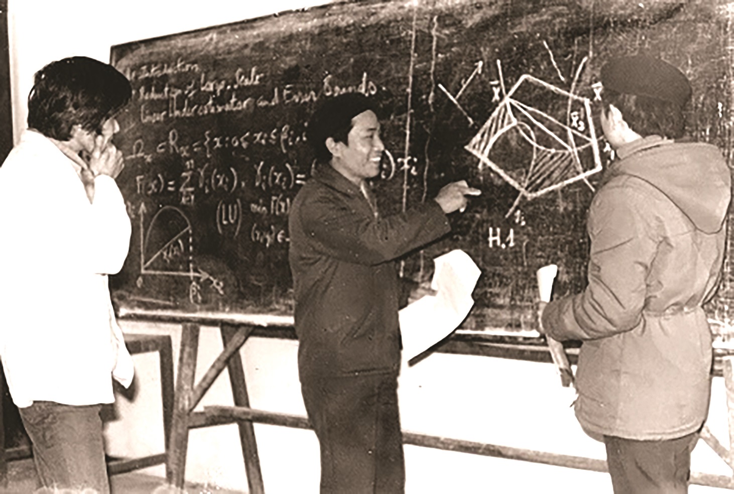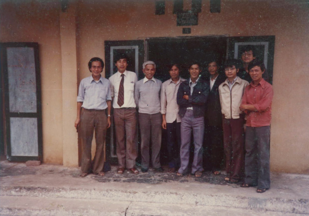 Phòng Tô pô – Hình học (Viện Toán học) và khách tại cơ sở Đội Cấn-Ba Đình, năm 1981. Từ phải: Nguyễn Sỹ Minh, Lê Dũng Tráng, Ngô Việt Trung, Lê Văn Thành, Nguyễn Hữu Đức, Hà Huy Vui, Hoàng Tụy, Kyoji Saito, Huỳnh Mùi (ĐH Tổng hợp Hà Nội).