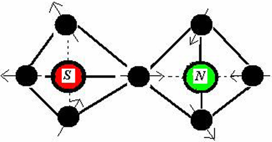 Sự hình thành các đơn cực tù trong mạng tinh thể: các mũi tên là các nam châm vi mô có hai cực Bắc & Nam, sau quá trình quay đảo của các mũi tên ta có vòng tròn N (Nord) mô tả một đơn cực Bắc còn vòng tròn S (Sud) – một đơn cực Nam.