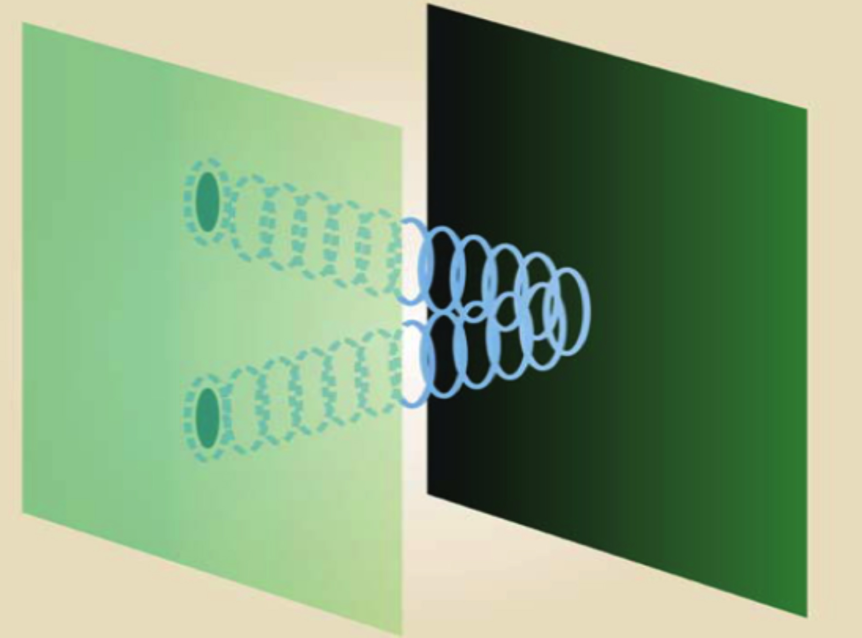 Hình 1. Đối ngẫu toàn ảnh ( holographic duality) cho phép thực hiện những tính toán thủy động học trong lý thuyết chuẩn bằng cách biến đổi thành những tính toán tán xạ (scattering calculations) trong một không thời gian nhiều chiều hơn. Mặt phẳng ở bên trái biểu diễn không gian 3 chiều, một lát cắt của không thời gian 4 chỉều, trên đó cư trú lý thuyết chuẩn đối ngẫu. Sự chuyển động thẳng góc với mặt phẳng đó là chuyển động trong chiều thứ năm, hấp dẫn tác động trong không thời gian 5 chiều. Mặt phẳng bên phải là chân trời 3 chiều của lỗ đen. Các phép tính toán khó thực hiện trong lý thuyết chuẩn 4 chỉều lại tương đương với những tính toán dễ dàng trong đó một graviton khuếch tán từ lỗ đen trong không thời gian 5 chiều.