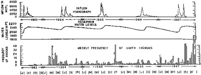 ![]() Biểu đồ 2. Quan hệ giữa mực nước và tần suất động đất xuất hiện tại đập Koyna |