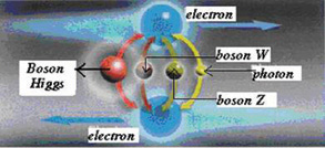 Hạt Higgs tồn tại (xem hình 3): lúc này khi hai electron va chạm nhau, chúng sẽ trao đổi hạt photon (tương tác điện từ), các boson W và Z (tương tác yếu) và hạt Higgs xuất hiện.