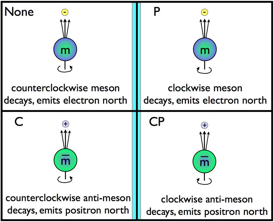 Bạn có thể minh họa điều này bằng bàn tay trái. Hướng ngón tay cái lên và cuộn bốn ngón còn lại. Nếu nhìn từ trên xuống ngón tay cái, bạn sẽ thấy bốn ngón tay dường như cuộn theo chiều kim đồng hồ. Nếu sau đó hạt bị phân hủy, thì “trục quay” (ngón tay cái của bàn tay trái của bạn) vẫn hướng lên, và điều đó sẽ được in dấu trên các hạt mới xuất hiện từ sự phân rã. Điều này về cơ bản khác với việc bạn sử dụng bàn tay phải, là hình ảnh phản chiếu qua gương của bàn tay trái.