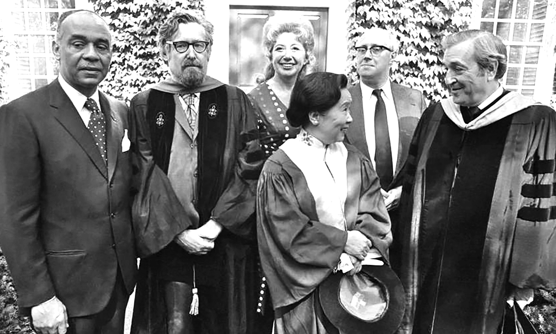 Hình 9: TS. Ngô Kiện Hùng (ở hàng phía trước) cùng với 5 người khác nhận bằng danh dự từ Harvard năm 1974. Bà là một trong những nhà vật lý thực nghiệm vĩ đại nhất trong lịch sử, có nhiều đóng góp quan trọng cho lĩnh vực vật lý. Việc bà bị bỏ sót không được nhận giải Nobel Vật lý 1957 vẫn là một trong những bất công lớn nhất trong lịch sử của giải thưởng này.