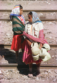 ![]() Phụ nữ Tarahumara truyền thống người mặc váy và đội khăn trên đầu |