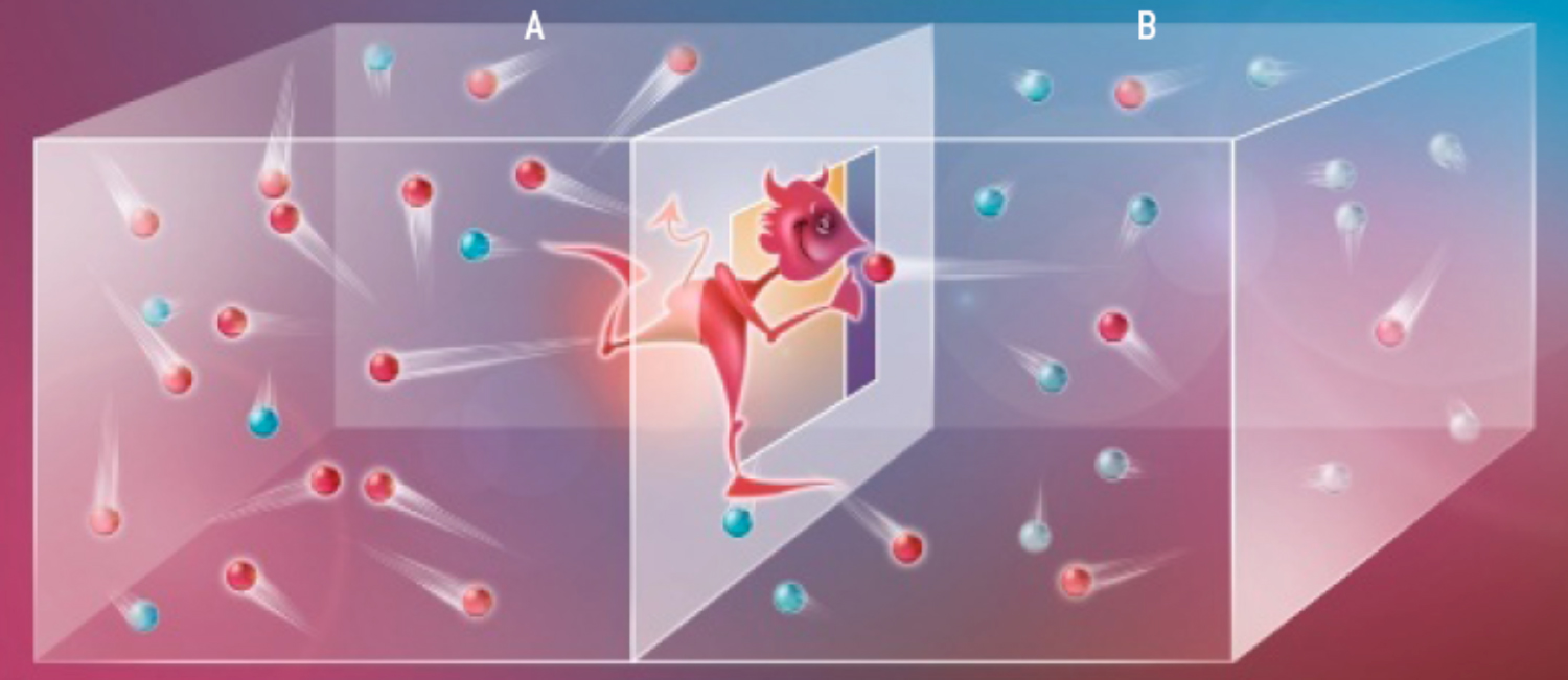 Hình 2. Trên hình ta có một chất khí nóng ở A và một chất khí lạnh ở B. Nhớ rằng nhiệt độ tương ứng với vận tốc trung bình của các phân tử (chính xác hơn nhiệt độ tuyệt đối tỷ lệ trung bình với bình phương của vận tốc các phân tử). Năm 1867 Maxwell viết cho một người bạn: “thử tưởng tượng có một sinh vật rất nhỏ có khả năng biết được thông tin về vị trí và vận tốc của tất cả phân tử sinh vật này nhờ đóng và mở một các cửa để lọt các phân tử nhanh từ B sang A và các phân tử chậm từ A sang B. Như vậy A trở nên nóng hơn và B trở nên lạnh hơn mà không có công nào sản ra ở đây”. William Thomson gọi sinh vật này là “con quỷ Maxwell”. Thí nghiệm tưởng tượng này đóng vai trò quan trọng trong việc thiết lập mối quan hệ giữa thông tin và entropy.