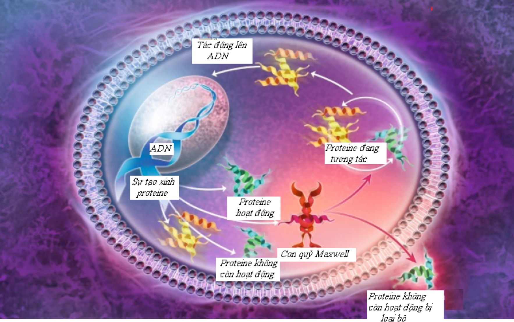 Hình 3. Sự hoạt động của một sinh thể trông giống như sự hoạt động của con quỷ Maxwell. Một tế bào tạo sinh ra protein nhờ ADN, trong đó một số protein là sai hỏng và cần phải loại bỏ. Một con quỷ Maxwell phân tử vốn cũng được sinh ra bởi ADN tế bào đã thực hiện việc chọn lựa đó. Những thực thể phân tử đóng vai trò quỷ Maxwell cần được phát hiện.