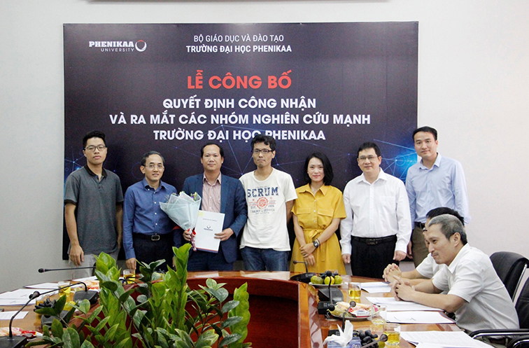 Nhóm HEPC trong ngày ra mắt nhóm nghiên cứu mạnh của trường Đại học Phenikaa: nghiên cứu sinh Nguyễn Tuấn Duy, PGS. TS Phùng Văn Đồng, TS. Shingo Takeuchi, TS. Ngô Hải Tân, TS. Dương Văn Lợi với TS. Hồ Xuân Năng, tổng giám đốc tập đoàn Phenikaa và GS. TS Phạm Thành Huy, hiệu trưởng ĐH Phenikaa.