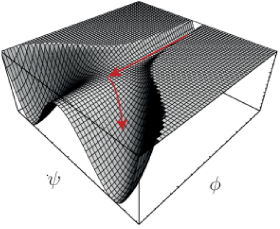 Lạm phát gây nên bởi trường inflaton (lạm phát). Các nhà vật lý đưa ra mô hình các lỗ đen nguyên thủy có khối lượng (bằng vài chục lần khối lượng mặt trời) có thể gây nên bởi lạm phát lai – hybrid inflation (tức lạm phát với trường inflaton có thế năng điều khiển bởi hai hàm Ψ và Ф) (xem hình 2).