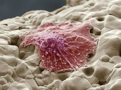 Dưới đây chính là tương lai của kỹ thuật chữa lành xương. Với chiều rộng khoảng 23 micromet, tế bào hình thành xương này có tên gọi osteoblast, đang bám vào một giàn giáo tổng hợp.