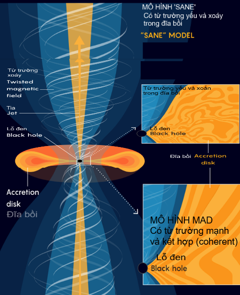 Từ trước đến nay, người ta thường dùng hai mô hình để miêu tả hiện tượng này. Đó là MAD (magnetically arrested disks – đĩa từ dừng) và SANE (stable and normal evolution-tiến triển ổn định và bình thường).