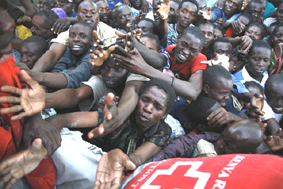 ![]() Những người dân Kenya tranh giành nhau thực phẩm cứu trợ từ Hội chữ thập đỏ quốc tế. |