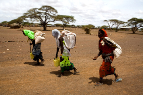 ![]() Phụ nữ Kenya băng qua những mảnh đất khô cằn để mang thực phẩm cứu trợ hàng tháng về nhà. |