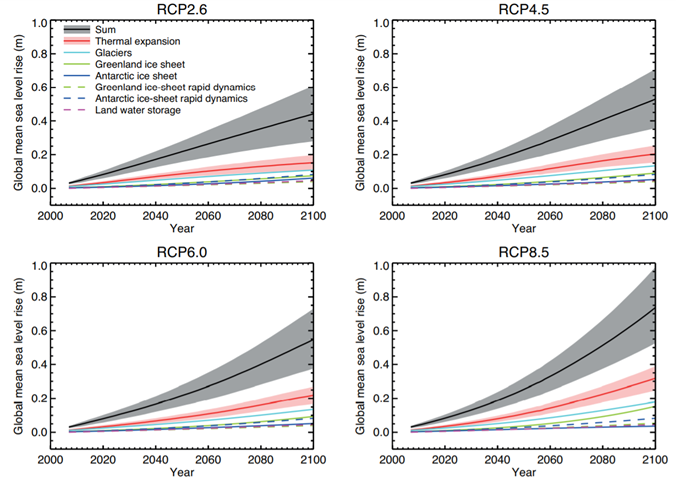 Hình 3. Dự báo nước biển dâng đến cuối thế kỷ theo 4 kịch bản nước biển dâng được đưa ra bởi IPCC. (Nguồn: Church et al., 2013)