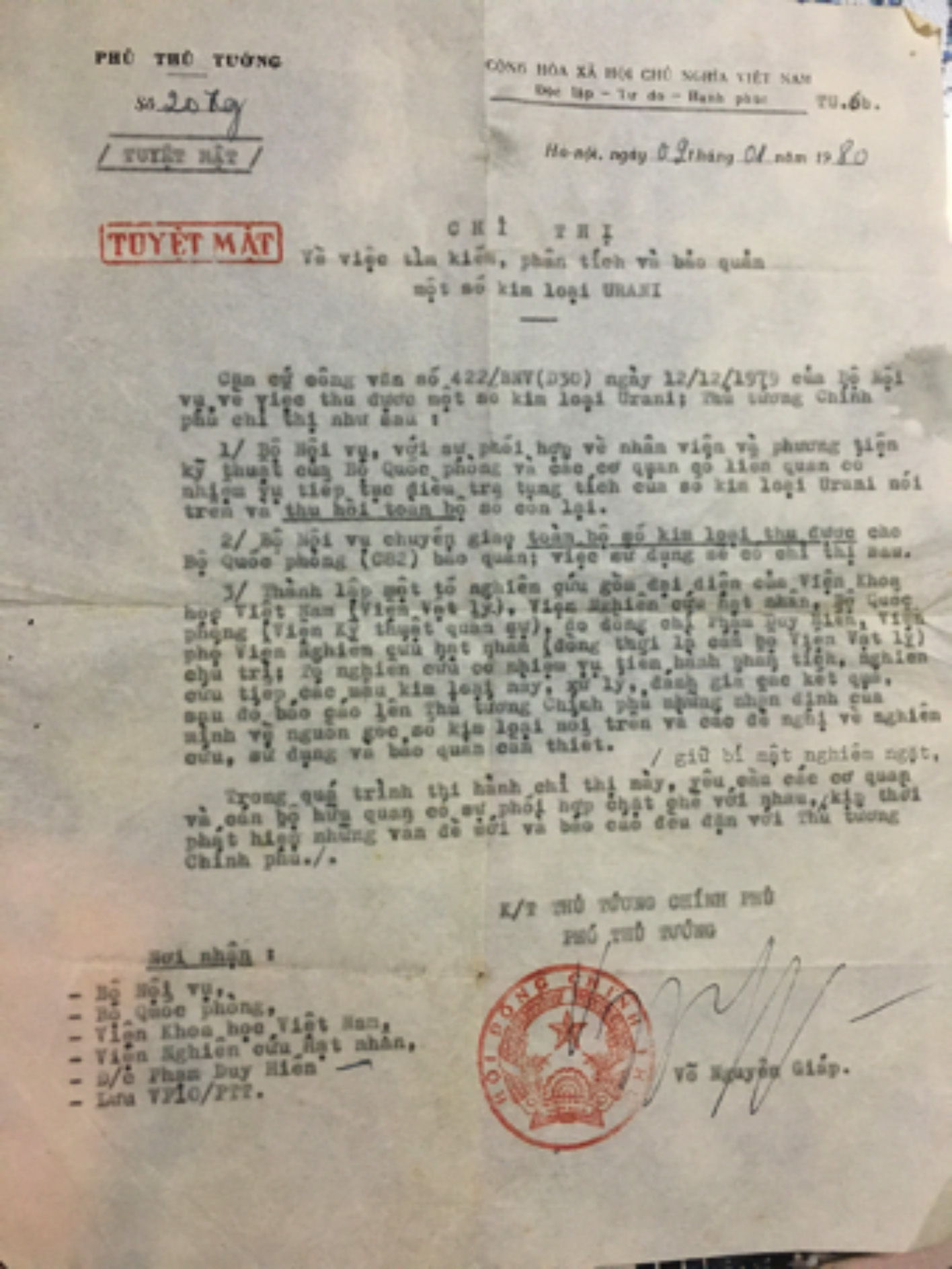 Sau khi báo cáo đầy đủ những phát hiện và nhận định trên đây lên Bộ Nội vụ, chúng tôi đề nghị Bộ tìm cách thu hồi toàn bộ và bảo quản urani nghèo theo quy chế phóng xạ và vật liệu hạt nhân, sớm chấm dứt nguy cơ người dân bị chiếu xạ khi cưa cắt để buôn bán. Ngày 9/1/1980, Chính phủ đã ra Chỉ thị Tuyệt mật Về việc tìm kiếm, phân tích và bảo quản một số kim loại URANI do Phó Thủ tướng Võ Nguyên Giáp ký.