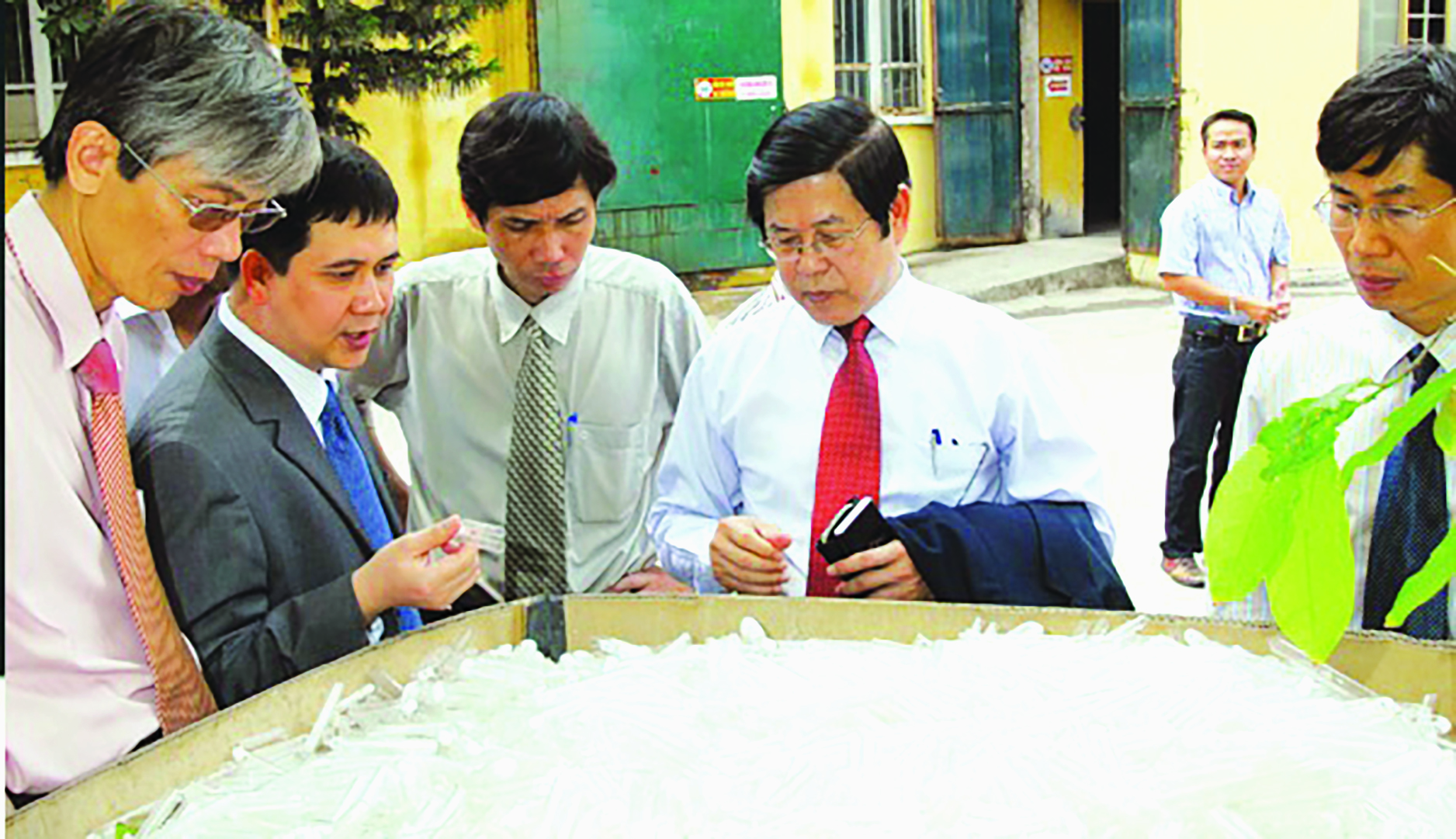 PGS. TS Phạm Thành Huy (thứ hai từ trái sang) trao đổi với ban lãnh đạo Rạng Đông về phương pháp thu hồi bột huỳnh quang. Nguồn: Rạng Đông.