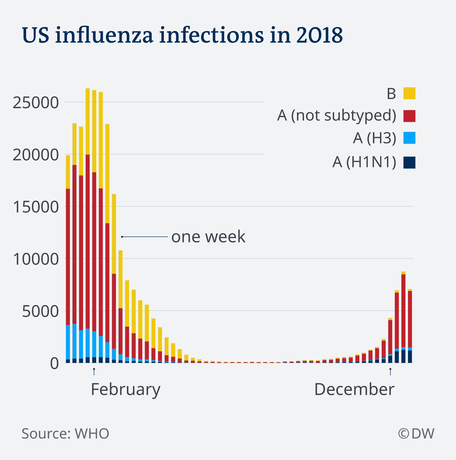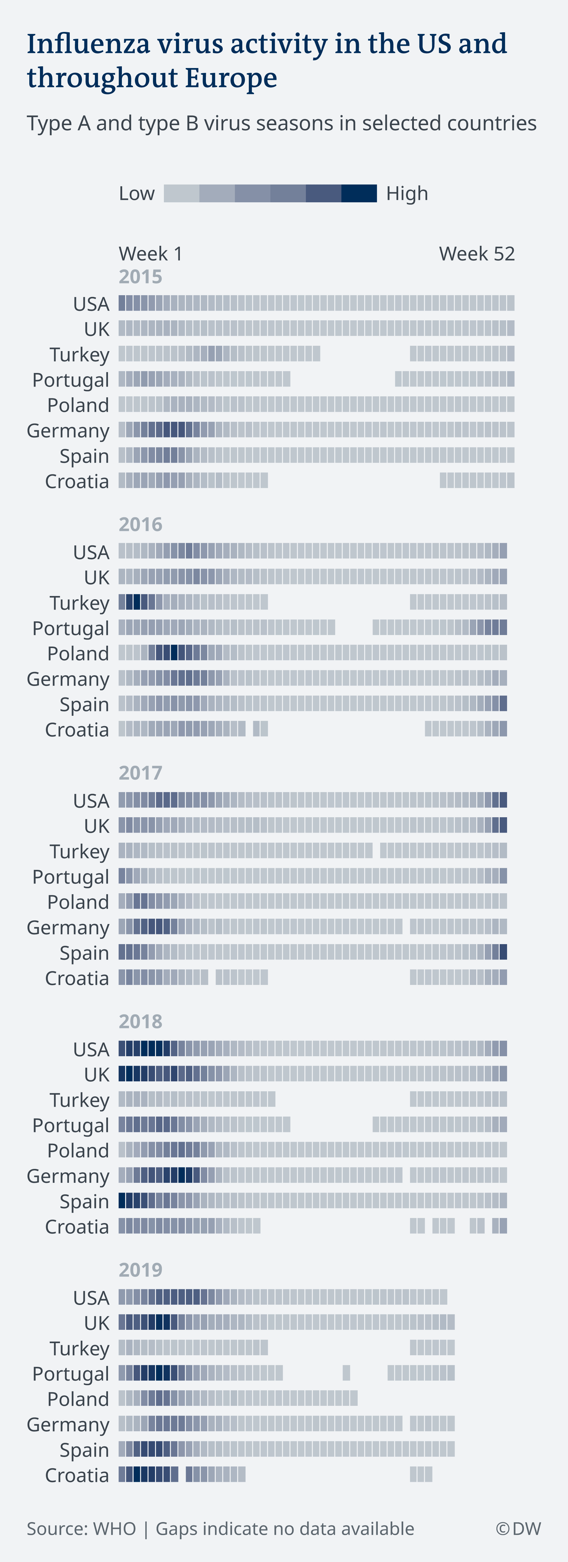DW đã phân tích dữ liệu về hoạt động của virus trên khắp Hoa Kỳ và Châu Âu được trích rút từ Hệ thống Giám sát và Phản ứng Toàn cầu của Tổ chức Y tế Thế giới (GISRS). Các kết quả cho thấy đã có sự gia tăng ổn định hoạt động của virus cúm đối với cả các phân nhóm virus A và B, đặc biệt là ở Hoa Kỳ, Anh, Bồ Đào Nha, Đức và Croatia.
