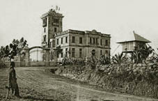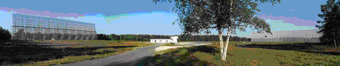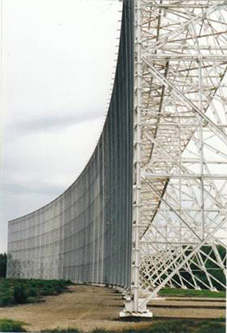 Hình 1: (a) Hệ kính thiên văn vô tuyến đặt tại Nançay, vùng đồng quê Sologne (180 km về phía Nam Paris), có 2 antenne khổng lồ đặt cách xa nhau 460 m. Phía bên trái hình là antenne phẳng (kích thước 200 m x 40 m) quay xung quanh một trục ngang và phản chiếu tín hiệu vô tuyến vũ trụ vào antenne cong (phía bên phải hình, kích thước 300 m x 35 m). Tín hiệu được hội tụ vào tiêu điểm (toà nhà thấp màu trắng ở giữa 2 antenne), nơi có máy quang phổ thu và phân tích tín hiệu. (b) Hình antenne cong, ở phía bên phải trong hình (a), được phóng to ra. Hệ kính Nançay, thuộc Đài Thiên văn Paris, được dùng để thu tín hiệu vô tuyến phát từ những pulsar, nhân của những ngôi sao đã nổ, cùng những thiên hà xa xôi. Kính thiên văn vô tuyến Nançay đã được Tổng thống Pháp, Charles de Gaulle, khánh thành mùa xuân năm 1965 (Hình Trung tâm thiên văn vô tuyến Nançay). |