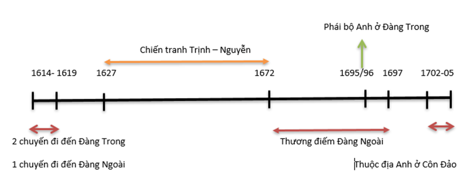 Niên biểu dưới đây đã chỉ rõ người Anh đã có ba giai đoạn đến Đàng Trong, bao gồm chuyến buôn từ Nhật Bản năm 1614 và 1617, chuyến đi sứ của Thomas Bowyear năm 1695-1696, và sau đó lập thương điếm và khu đồn trú tại Côn Đảo (1702-1705). Trong khi đó, người Anh chính thức xây dựng thương điếm tại Đàng Ngoài trong vòng 25 năm (1672-1697). Những tiếp xúc đó diễn ra trong bối cảnh trước và sau cuộc chiến tranh Trịnh – Nguyễn (1627-1672) nên quan hệ Anh – Việt có thể nói là không chịu tác động trực tiếp từ nguy cơ chiến tranh hay nhu cầu về đồng minh như người Bồ Đào Nha, Hà Lan đã trải qua tại Việt Nam.