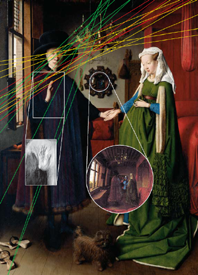Giáo sư David G. Stork ở Đại học Stanford cùng các cộng sự đã sử dụng những kỹ thuật đồ họa máy tính để kiểm tra lại lý thuyết mà Hockney và nhà vật lý Charles Falco ở Đại học Arizona đã đưa ra. Theo Hockney, một số họa sỹ từ những năm 1425 đã sử dụng một loại “máy ảnh” nguyên thủy. Loại máy ảnh này dĩ nhiên là không có phim, nó chỉ đơn giản là một thấu kính hội tụ, cho một ảnh thật ngược chiều in trên màn. Họa sỹ sẽ vẽ theo những đường nét của hình ảnh đó, mặc dù theo như chính Hockney nói, làm được như vậy cũng là rất khó. Theo Hockney, họa sỹ cũng có thể dùng gương cầu lõm vì nó cũng cho hiệu quả giống như thấu kính hội tụ. Nhưng vào thời của Eyck, chế tạo một chiếc gương như vậy là quá phức tạp về mặt kỹ thuật và chưa có bằng chứng cho thấy bất cứ ai ở thời đó đã từng mô tả về những ảnh do một gương cầu lõm tạo ra.