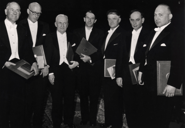 Các nhà khoa học đoạt giải Nobel năm 1958, từ trái qua phải: George Beadle, E. L. Tatum, Igor Yevgenyevich Tamm (vật lý), Frederick Sanger (hóa học), Pavel Alekseyevich Cherenkov (vật lý), Ilja Mikhailovich Frank (vật lý), Joshua Lederberg (y học). Nguồn: circulatingnow.nlm.nih.gov