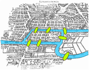 Ở thành phố Königsberg, có 7 chiếc cầu. Chúng nối hoặc là hai bờ sông, hoặc một bờ sông và một trong hai cù lao, hoặc nối hai cù lao đó. (Xem bản đồ dưới đây).