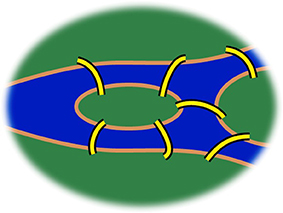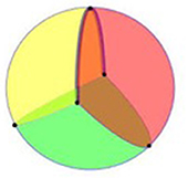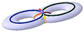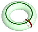 Tiếp theo, hãy lấy một mặt “xuyến kép”, có được bằng cách dính 2 chiếc săm ôtô vào nhau. Bạn hãy tự chọn một cách chia mặt “xuyến kép” thành các mặt giống như hình vuông (cong), các cạnh (cong), và các đỉnh. Chẳng hạn, ta chọn cách chia mô tả bằng hình vẽ trên. Các đường đỏ và vàng cắt nhau ở 2 điểm (1 điểm nhìn thấy, 1 điểm là hình chiếu thẳng đứng của điểm nhìn thấy), vậy d= 2. Các đường đỏ và vàng được 2 đỉnh ấy chia làm 4 cạnh (4 nửa đường tròn), cộng thêm 2 đường màu xanh, vậy c= 6. Sau khi cắt theo các đường ấy mặt xuyến kép bị chia thành ra 2 hình chữ nhật, vậy m= 2. Ta có m – c + d = 2 – 6 + 2 = -2. Như thế, số Euler của xuyến kép là -2.