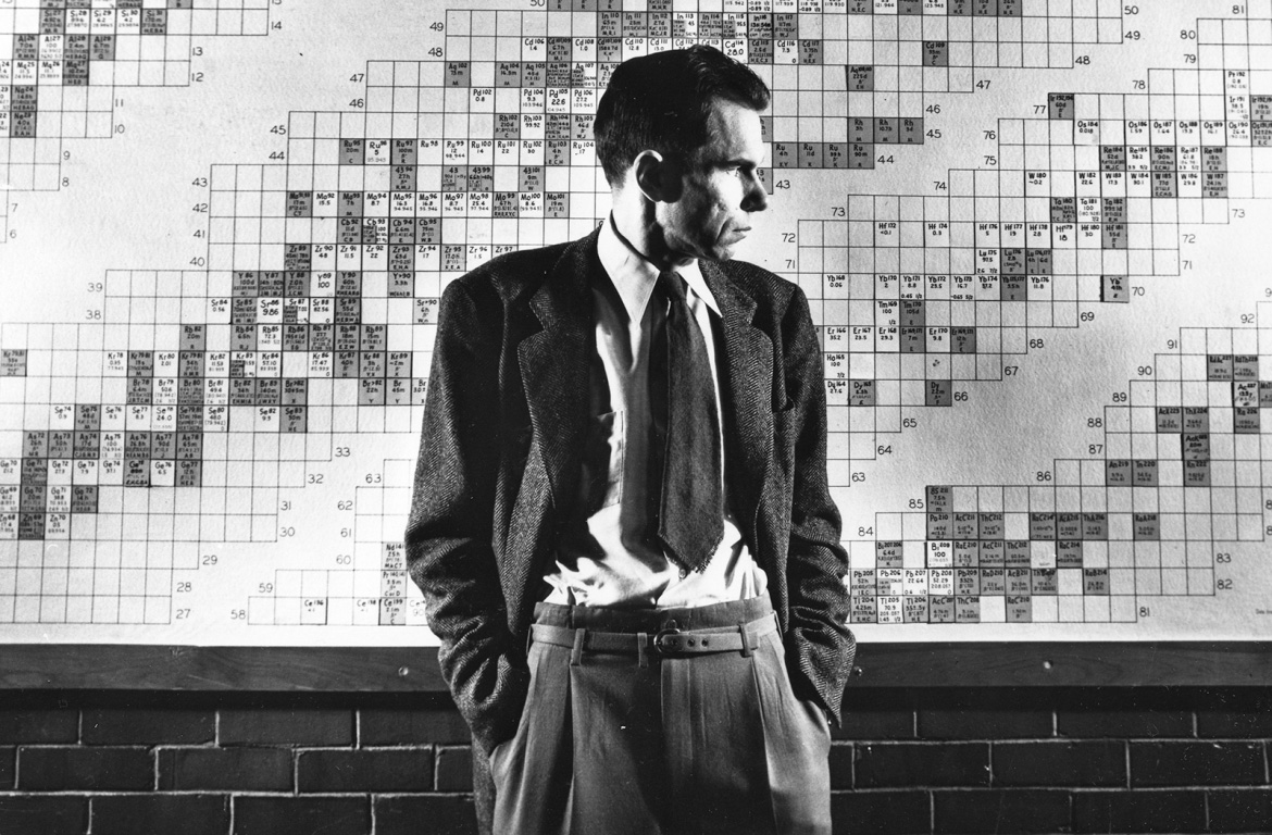 Nhà hóa học Glenn Seaborg, người đã tham gia khám phá 10 nguyên tố trong phòng thí nghiệm trong cuộc chiến “Transfermium” để tìm kiếm các nguyên tố mới. Ảnh: Seaborg đứng trước một bảng đồng vị vào năm 1946. Nguồn: Argonne National Laboratory, courtesy of AIP Emilio Segrè Visual Archives.