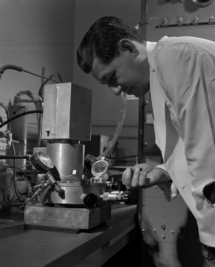 Albert Ghiorso đặt một mẫu vào buồng lưới alpha. Máy dò này được sử dụng để khám phá các yếu tố 97, 98, 99, 100 và 101. Ảnh: Lawrence Berkeley National Laboratory